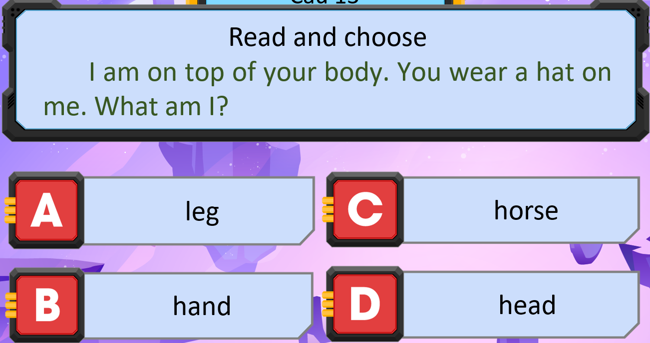 Giải thích: I am on top of your body. You wear a hat on me. What am I?: Tôi nằm ở phía trên cùng của cơ thể. Bạn đội mũ lên tôi. Tôi là ai?