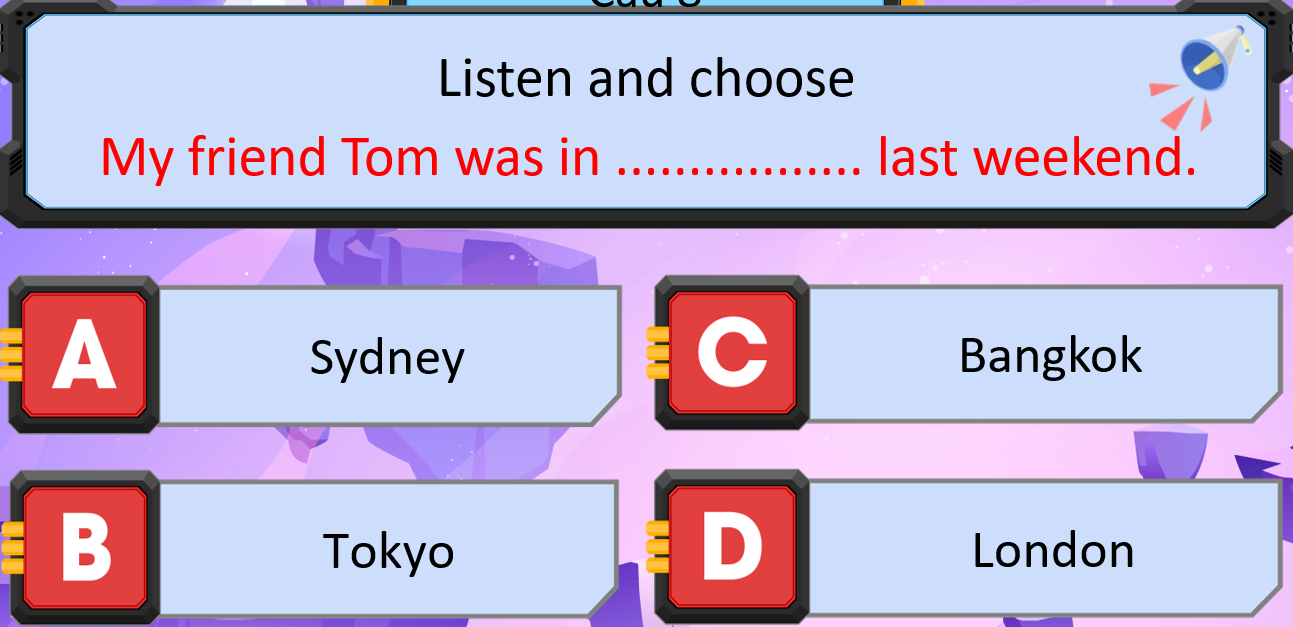 Giải thích: My friend Tom was in London last weekend.: Bạn của tôi đã ở Luân Đôn vào cuối tuần trước.