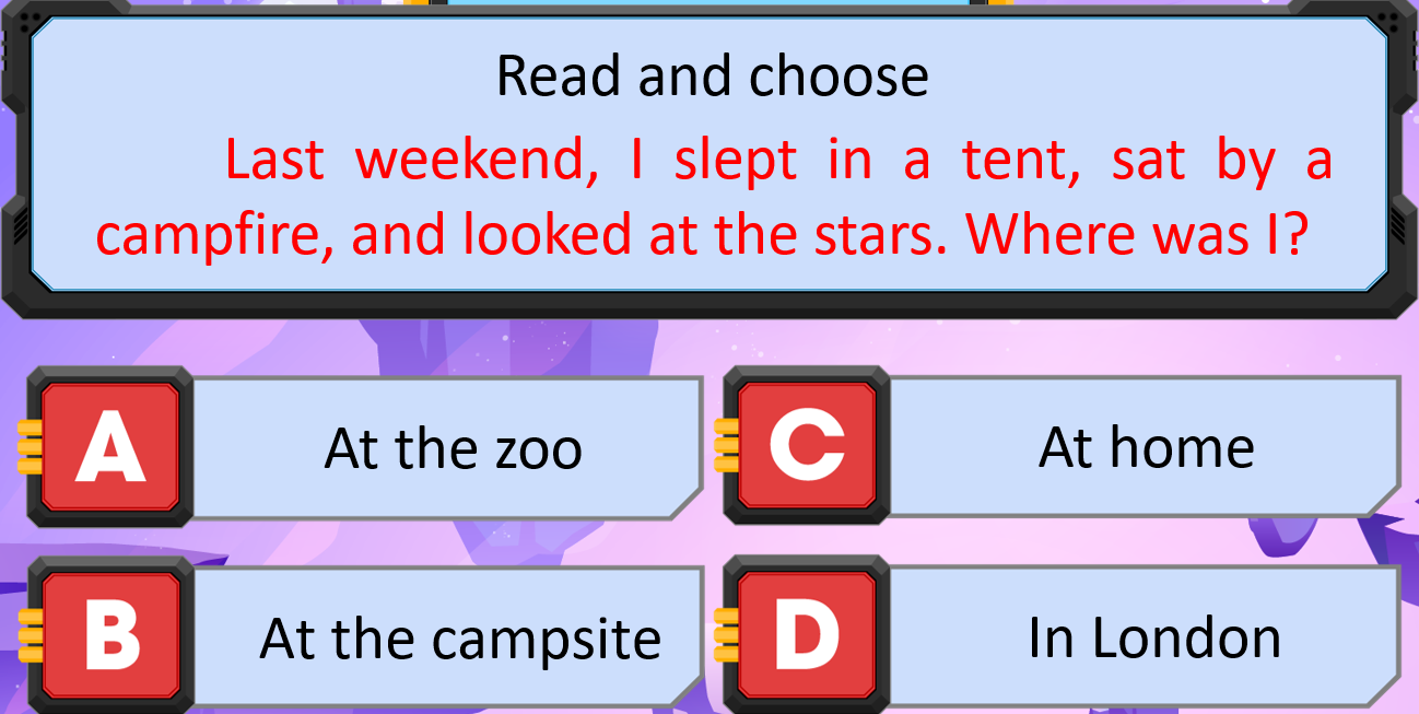 Giải thích: Last weekend, I slept in a tent, sat by a campfire, and looked at the stars. Where was I?: Cuối tuần trước, tôi ngủ trong lều, ngồi bên đống lửa trại và ngắm các vì sao. Tôi đã ở đâu?