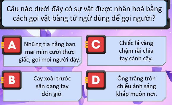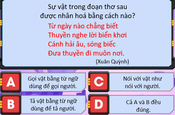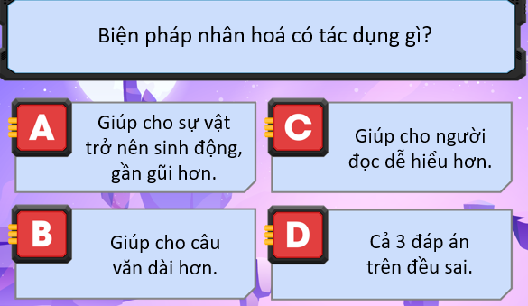 Đáp án: A. Giúp cho sự vật trở nên sinh động, gần gũi hơn.
